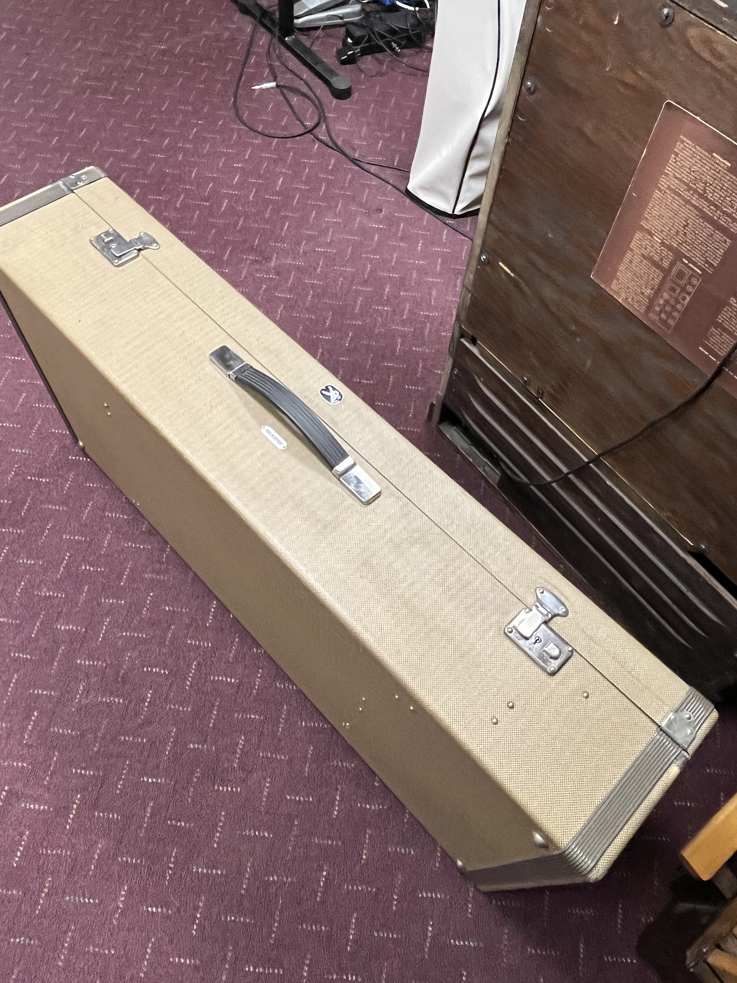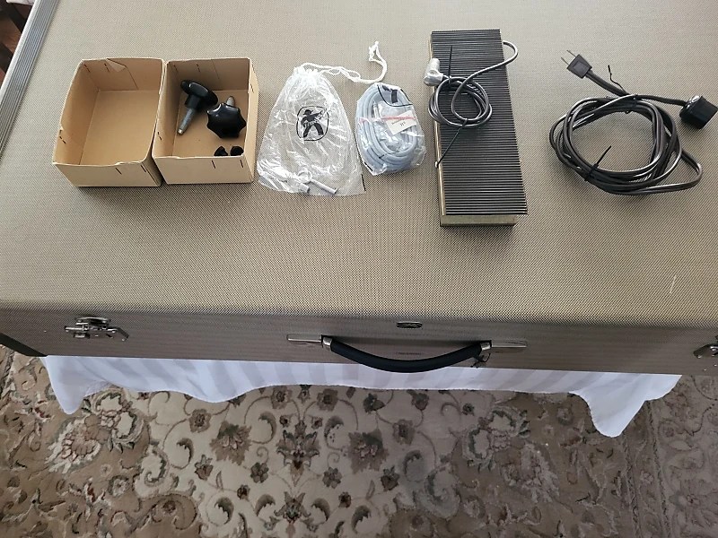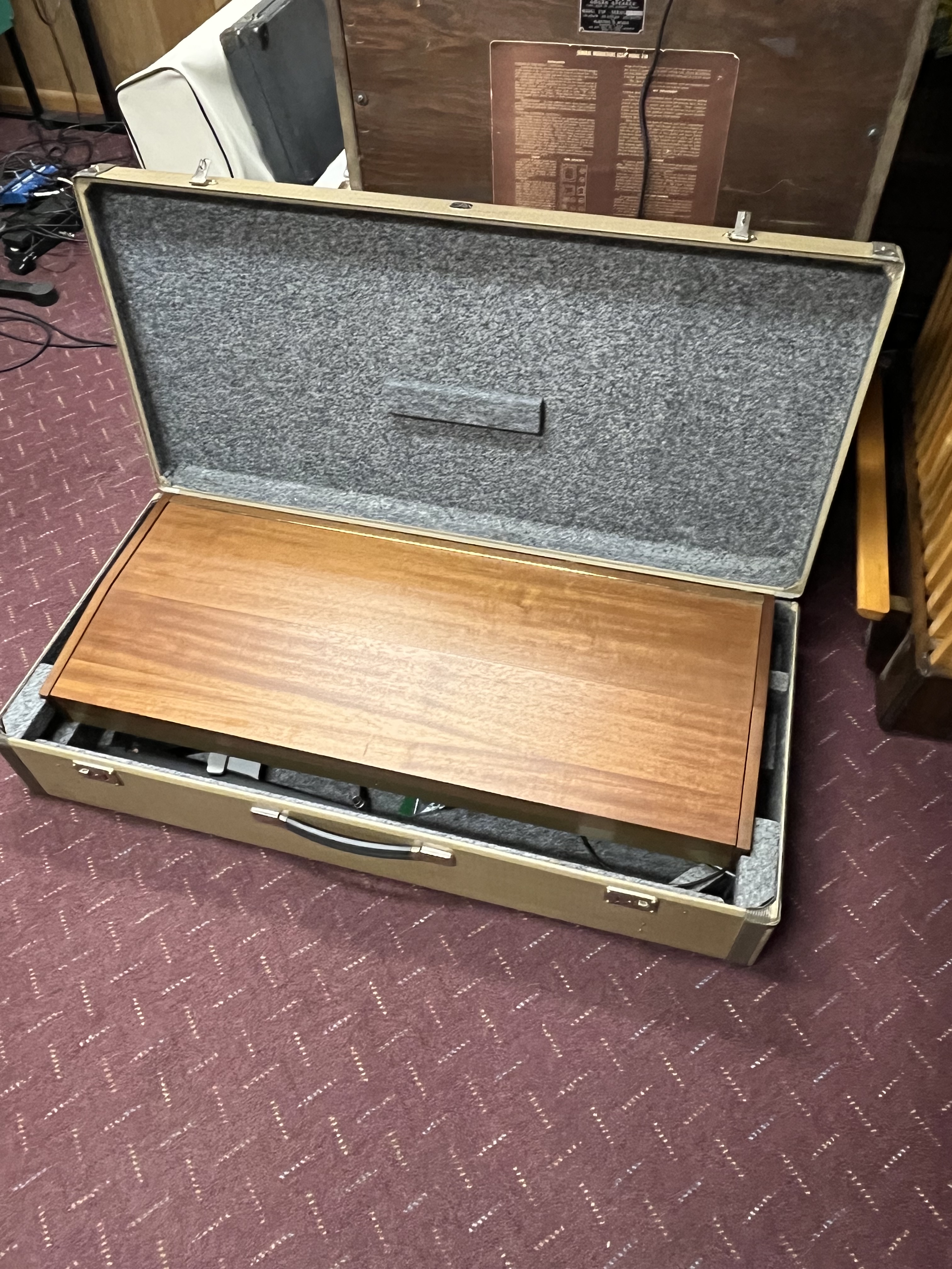I stopped by to take a look. It didn’t work at all, but it was very close to mint condition, and came with all the accessories — a hard-shell case, the legs, leg brace, volume pedal and all the knobs and thumbscrews to hold the legs in place. The seller offered it at an extremely reasonable price, so I bought it. Another project…