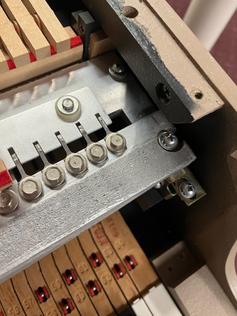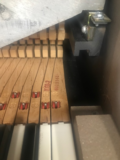 After owning this piano for eight years, I finally decided to give it the complete “beauty treatment:” I got some Protek CLP piano lube, and lubricated all the hinged joints in the action and the key rail pins. And then I used a capstan wrench to regulate the lost motion and the let-off. This turned out to be a lot of work (in part because I had never regulated a Wurli before), but it was well worth it. (Details of regulating the piano are contained in the 140B’s service manual.) I also dealt with a handful of keys whose volume was too loud or too soft, or didn’t sustain properly. Now, every key sounds consistent. The piano was playing very nicely before I did this, but now it’s really outstanding. It now has an excellent dynamic range, and is set up to have a nice “bark” when you push it a little.